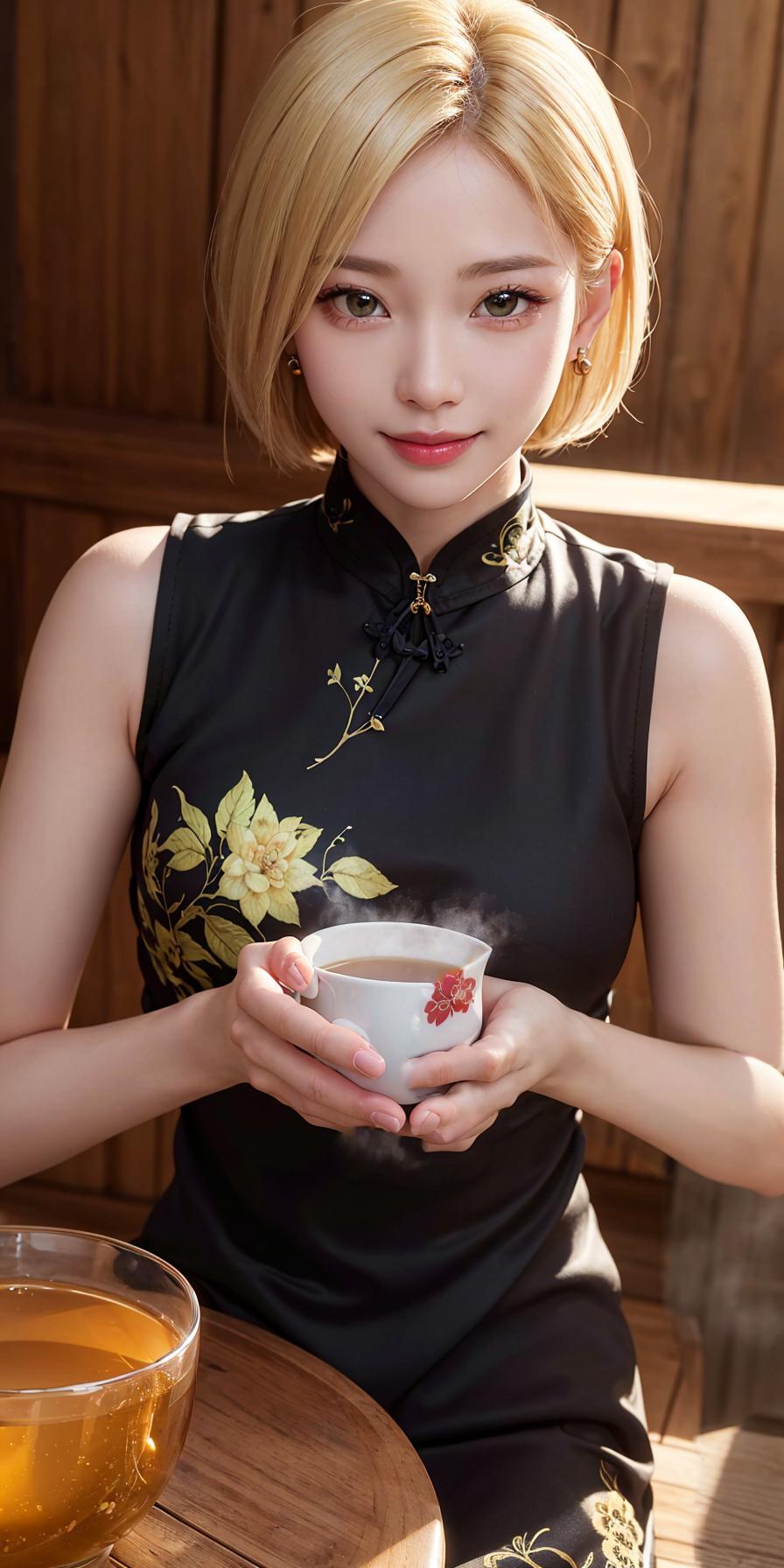 (long cheongsam, black cheongsam:1.2), shanghai, tea pot, wooden table, steaming