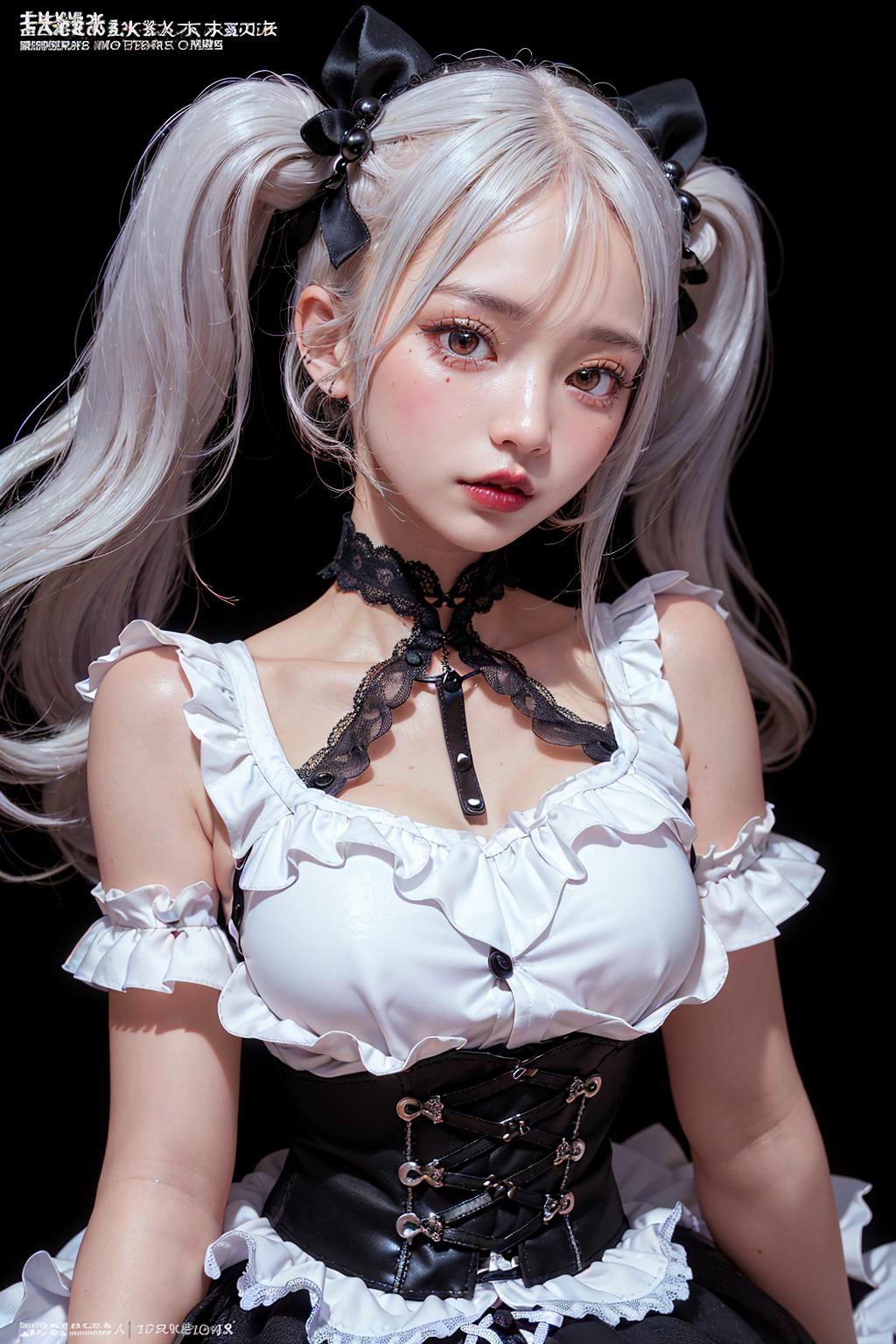 1girl, beautiful face, jirai kei, light silver hair, twin tails, eye shadow, dark lips,