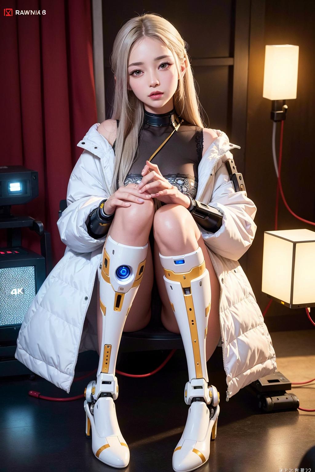 full body, sitting, robotic arms around knees,
