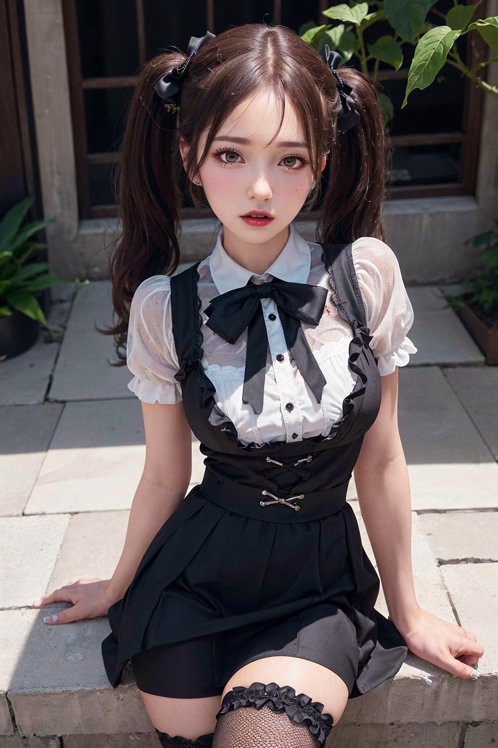 1girl, beautiful face, jirai kei, twin tails, eye shadow, dark lips,