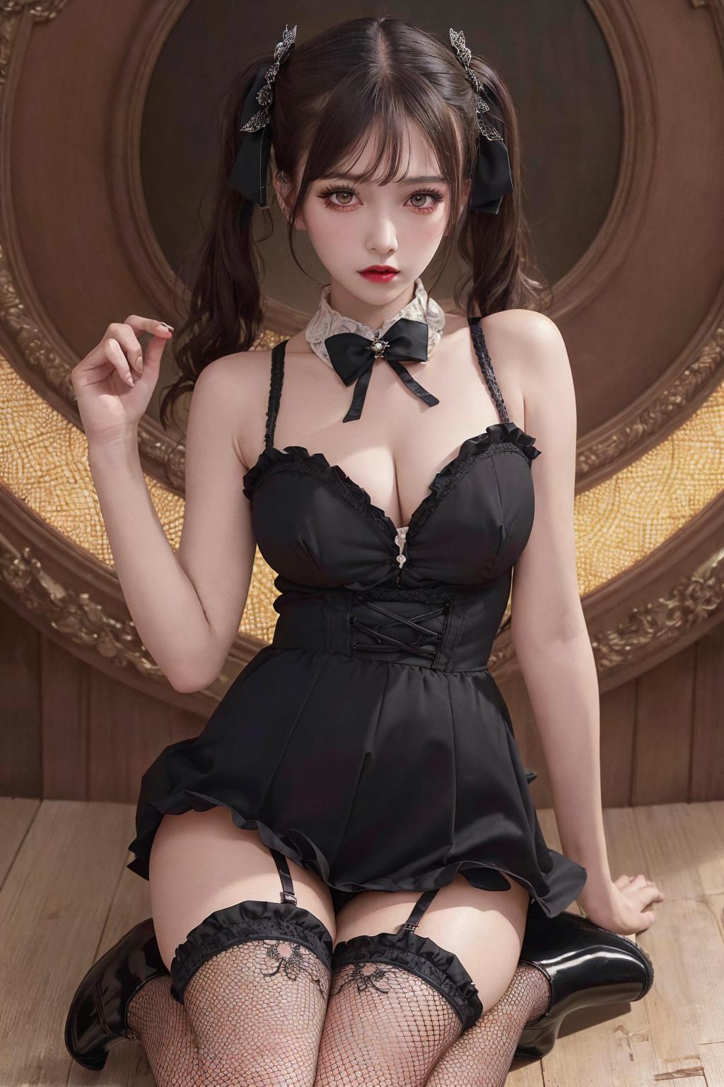 skirt, frills, band, shiny skin, skin pore, highly detailed skin, medium breasts, lace rims, choker, slim legs, fishnet stockings, slim waits, platform shoes,