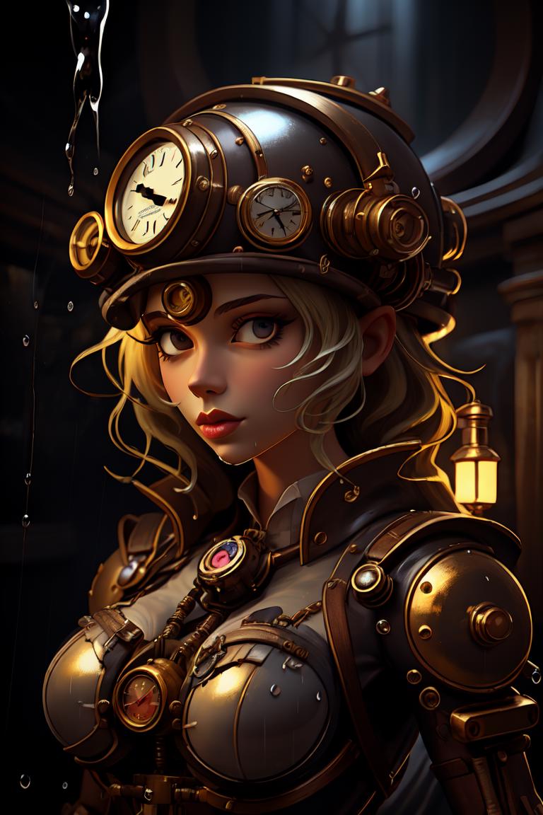olpntng style, high quality steampunk portrait of the woman called Goddess Time with a clock for a head played by Sam Elliott, clock goggles, amazing background, by tomasz alen kopera and peter mohrbacher, dripping sparks, rain, sharp focus, clear, vibrant, denoised, intricately detailed, amazing clock, 32k, steampunk clock render engine, oil painting, heavy strokes, paint dripping,HZ Steampunk,dashataran,3d style,perfecteyes,mecha,fantchar<lora:fantchar_v4:1>