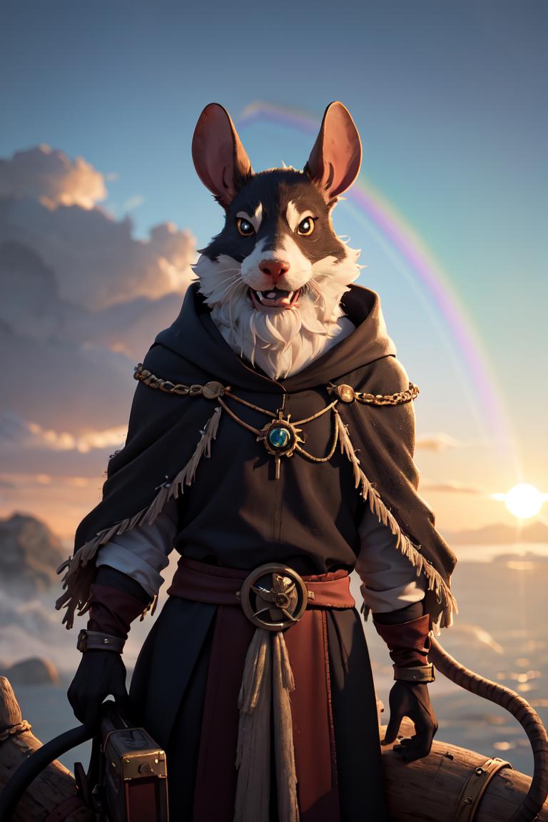 (masterpiece:1.2), an awarded photography of Tretch Craventail – A devious Skaven chieftain with a long, rat-like tail and clad in tattered robes., at Rainbow: A stunning arch of colors across the sky, created by the dispersion of sunlight in raindrops. , masterpiece, ultrasharp, depth of field and boekh, best quality,