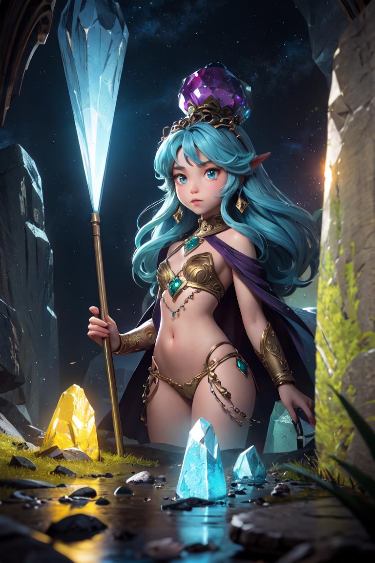 extremely detailed illustration of a cosmic deity, backlit, highly illuminated, colorful crystal, floating hair, closeup, visually rich, manga, whimsical, JRPG, enchanting, emotionally evocative, detailed environment, fantastical, imaginative, visually rich, atmospheric, zoomed, flat lighting, 2d, cartoon, vector, rocks, ink strokes,(HDR:1.4)