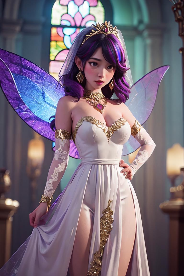 ((Fairy)),Story, bride posing under a (fairy tale), elaborate scene style, glitter, purple, realistic style, 8k,exposure blend, medium shot, bokeh, (hdr:1.4), high contrast, (cinematic, purple and white film), (muted colors, dim colors, soothing tones:1.3), low saturation, (hyperdetailed:1.2), (noir:0.4),Stained Glass Dress, Colored, Rainbow Background, Gold Stained Glass Weave, Rainbow Theme, <lora:UE_20230717224732:1>