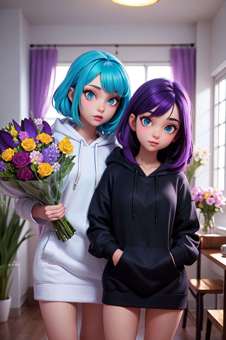 (2 girl))(1nd girl) (Purple Hair) (Long Hair) (Glowing Purple Eyes) (Wearing Black Hoodie) (In a Pretty Room with flowers) (DX12 Graphic) (2nd girl) (Aqua Blue Hair) (Wearing Long Hoodie) ( Blue Eyes Shining) (Beautiful room full of flowers) (Medium Hair) (Total Characters 2) (Graphic DX12) TWO CHARACTER CHAR 1 Blue Char 2 Purple