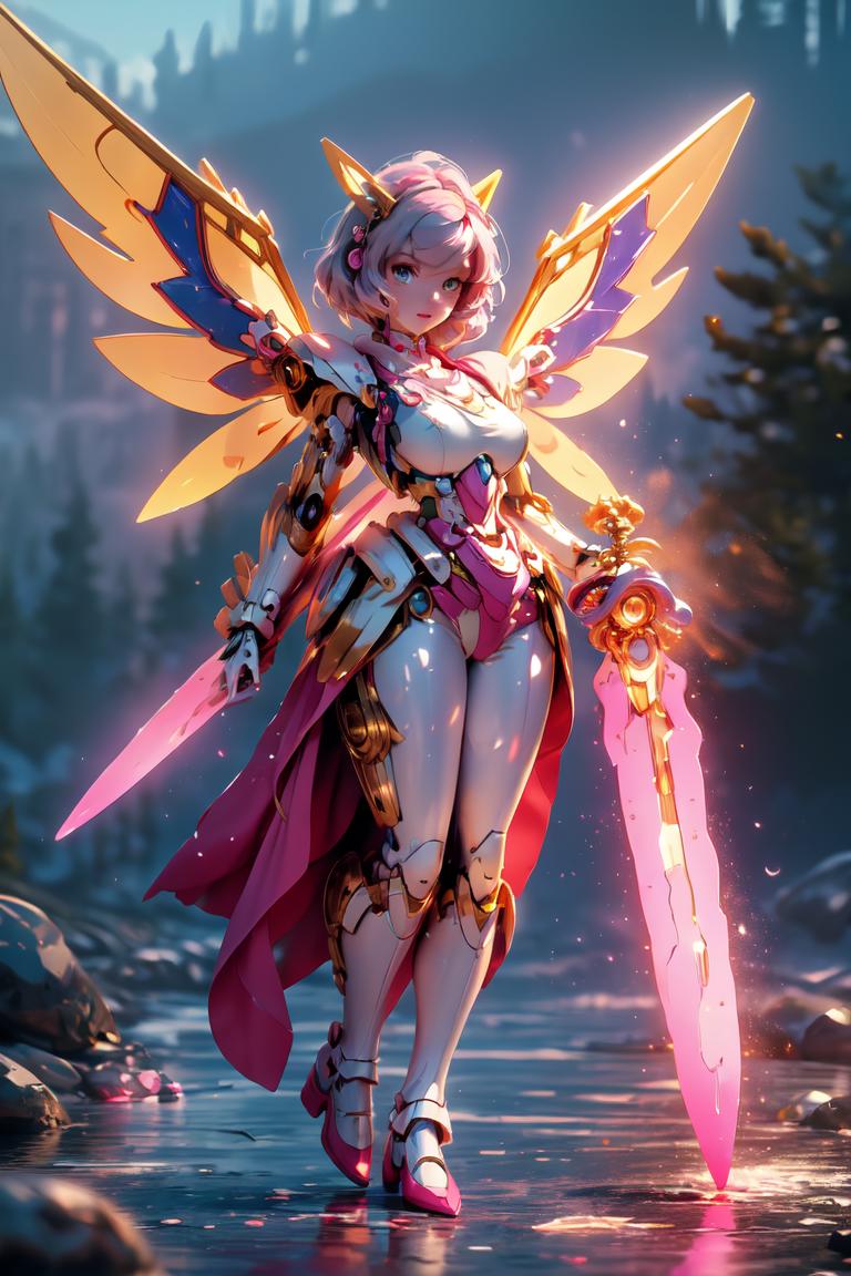 (Masterpiece:1.2),best quality,fine art masterclass splash spray trickle daubs of rainbow opaline Prisma Sakuraoil color,Steampunk celestial ethereal ghostly Fairy, HDR, ultra high-detail, centered, bokeh, lens flare, foggy dusk, bloom, light bloom, cinematic lighting, high dynamic range, depth of field, full pose,full body ,gundam <lora:Gundam girl_20230712160146:1>,pink