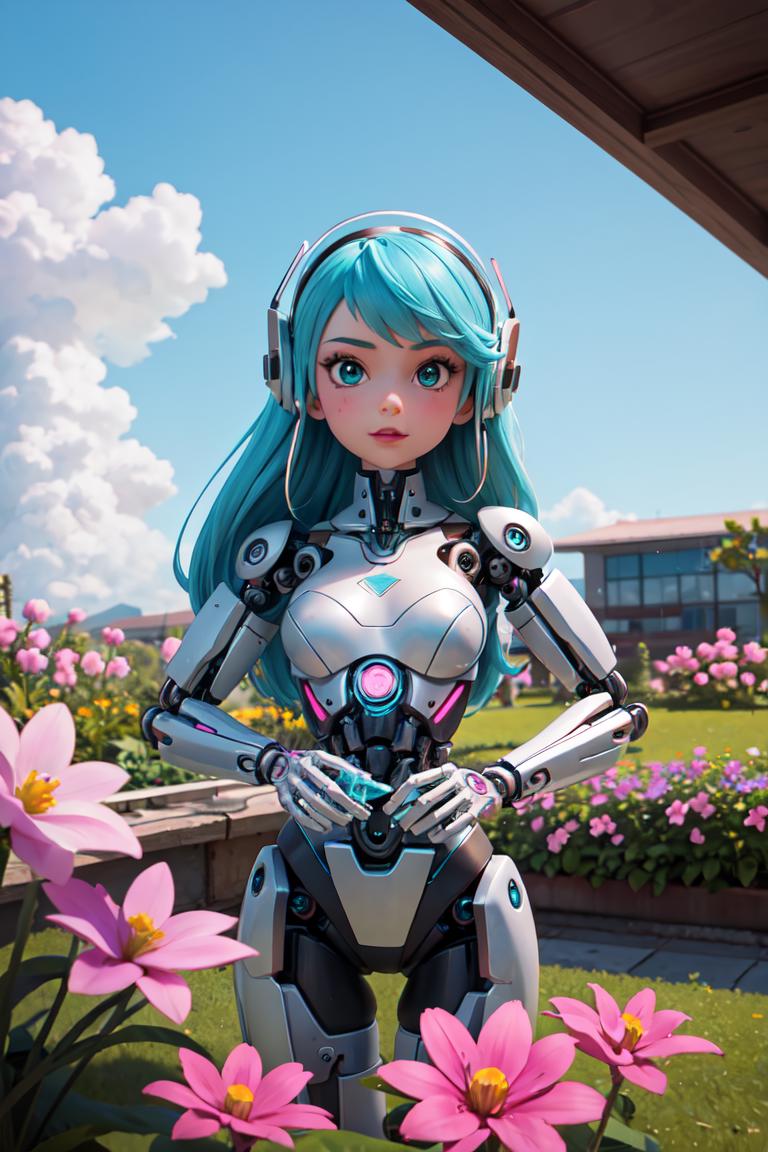 figure of biomechanical cyborg little girl made of glass was (picking a flower by hands), transparent, see-through intricated interal mechanical metal part, metal array, hi-tech, sci-fi, difficult, chip, circuit, post-production, elegan, teal and pearl white , ((She was picking pink flowers)) ,flower garden, outdoor,high_res,cyborg style