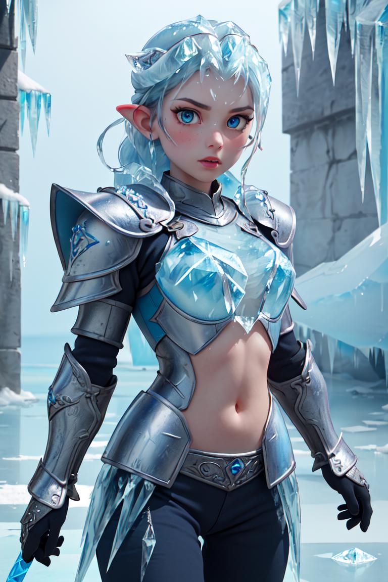 (Masterpiece:1.3), Highres, best quality, (extremely detailed, area lighting in background, HD, 8k, extremely intricate:1.3), (cowboy shot), Painting, 1 girl, ice dragon, blue eyes, (((ice forming on the body to form armor:1.2))),(Ice armour:1.5),ice, (ice sword:1.2),GlowingRunes_blue, runes on stomach (ice dragon in the background)