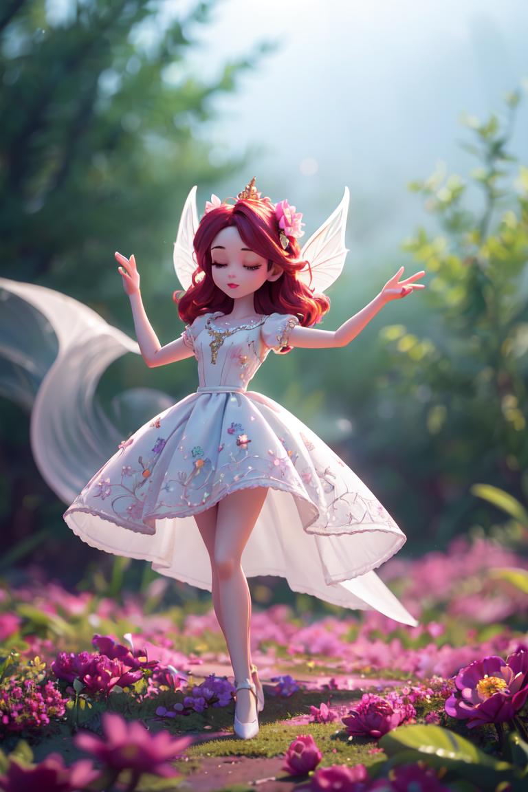 (Masterpiece, best quality:1.4), 8k, (top quality), (Centered), (ultra-detailed portrait), hyperrealistic, (3d), mid shot, full body, dramatic, dynamic pose, arms above head, coralinefilm, (stop motion), cgi, animated, ((cinematic)), beautiful doll, floating, perfect figure, outdoors, scenery, nature, flower dress, floral print, solo, pixie dust, fae, twilight, iridesent, atmosphere, fantastic composition, looking up, dreaming, half-closed eyes, elegent, dreamy, ethereal goddess of magic, soft makeup, (volumetric lighting), (shiny:1.1), ((intricate details, hyperdetailed)), shadow, ((blurry background)), (deep depth of field:1.3), sharp focus, beautiful, (dreamy, soft lighting:1.3), (dynamic), ((extremely detailed background)),motion blur