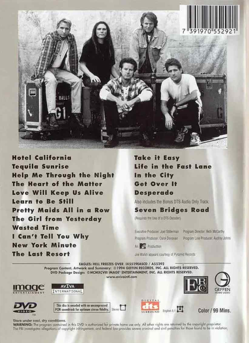 1.Program Start;Coming Together 片头:一起来 2.Practic Makes Perfect 演习做到最好 3.Backstage Jittere 后台的紧张 4.Showtime 演出时间 5.Hotel California 加州酒店 6.Tequila Sunrise 龙舌兰日出 7.Help Me Through The Night 帮助我渡过黑夜 8.The Heart Of The Matter 事情的中心 9.Love Will Keep Us Alive 爱情使我活下去 10.Learn To Be Still 学会静下来 11.Pretty Maids All In A Row 队中美丽的少女 12.The Girl From Yesterday 昨日的女孩 13.Wasted Time 浪费时间 14.I Can't Tell You Why 我只能告诉你为什么 15.New York Minute 纽约分钟 16.The Last Resort 最后的胜地 17.Take It Easy 轻松 18.Life In The Fast Lane 快线生涯 19.In The City 城市里 20.Get Over It 克服 21.Desperado 亡命之徒 22.Seven Bridges Road 7桥路