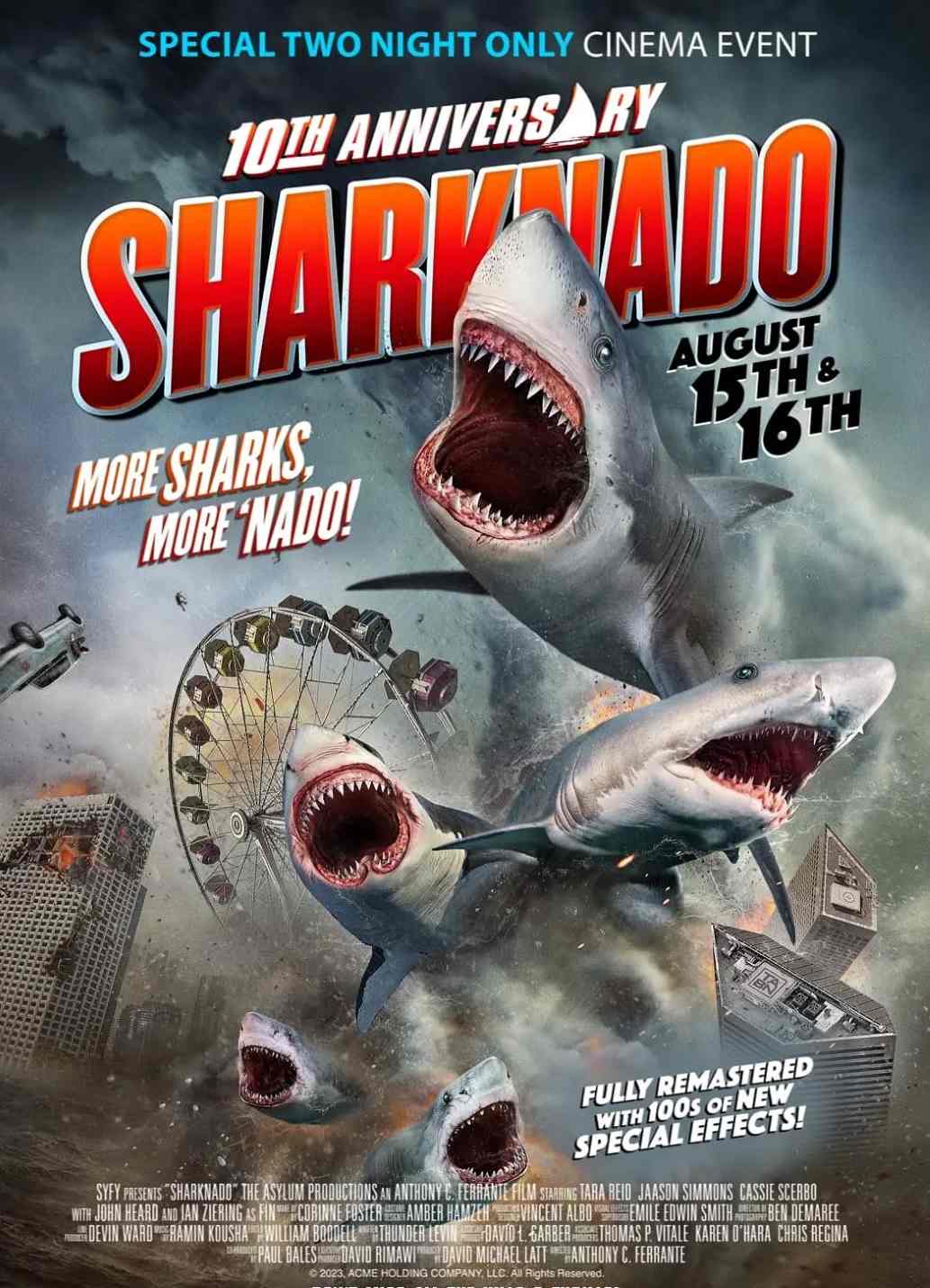 所谓“鲨龙卷”,其实就是龙卷风袭过鲨鱼活跃的海域,将那里的海水和鲨鱼一同卷起带到别的地方,有点类似青蛙雨,只不过从天而降的是张着血盆大口的大白鲨! 这部《鲨龙卷》(Sharknado)的故事发生地设定在洛杉矶,主演有塔拉·蕾德(Tara Reid)等。本周四晚九点该片将在Syfy科幻频道全球首播。