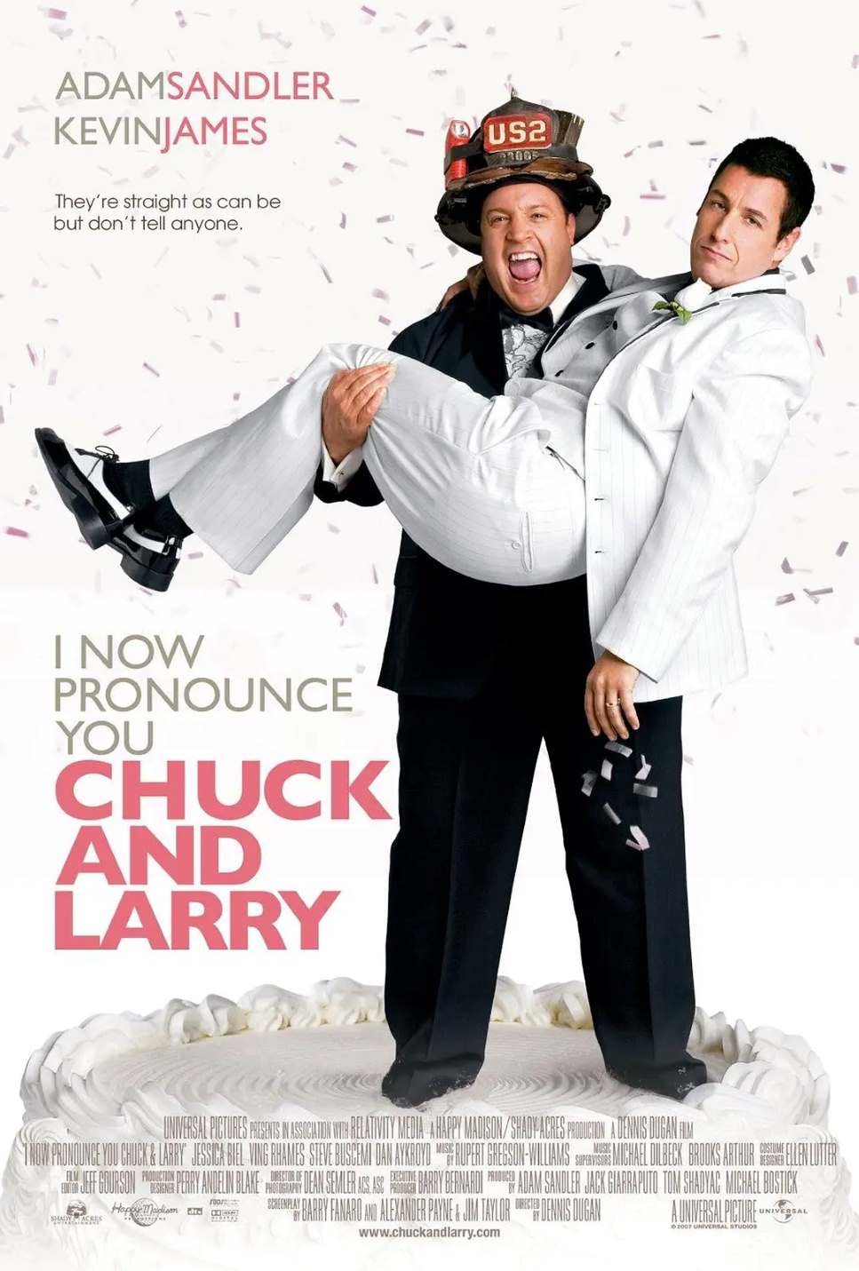ChuckLevine(AdamSandler饰)和LarryValentine(KevinJames饰)是同一个消防站的消防队员,二人在工作上默契十足,更是无话不谈的好兄弟。私底下,ChuckLevine是一个无女不欢的花花公子;而LarryValentine却对已故前妻情有独钟,全心照料他们的一双小儿女。为了让孩子成为自己的人身保险受益人,LarryValentine必须结婚,对女人兴趣缺缺的他,想出了一个“好主意”:和ChuckLevine扮成同性恋假结婚。乱哄哄的婚礼之后,两人的生活发生了翻天覆地的变化。为了应付政府官员的检查,他们住在了一起,并参加同性恋派对,面对抗议的群众慷慨陈辞,甚至大打出手,从“假玻璃”变成“真斗士”,在同性恋人群中知名度迅速扩大,但是也受到消防队同事的歧视。更要命的是,ChuckLevine似乎遇上了他的真命天女:为他们辩护的美女律师(JessicaBiel饰)。两人暗生情愫,但是苦于,ChuckLevine的同志身份,无法进一步发展。事情很快超出了ChuckLevine和LarryValentine的控制范围,怎样将生活纳入正轨,成为他们不得不想办法解决的问题。