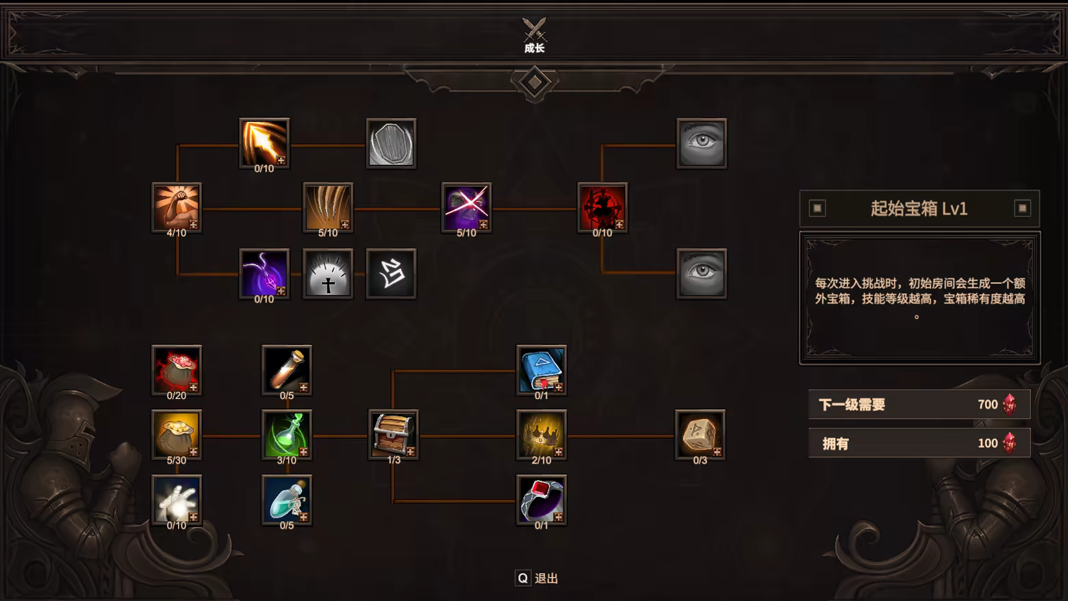 局外成长——挑战中获得的点数可以在大厅内对人物进行永久强化