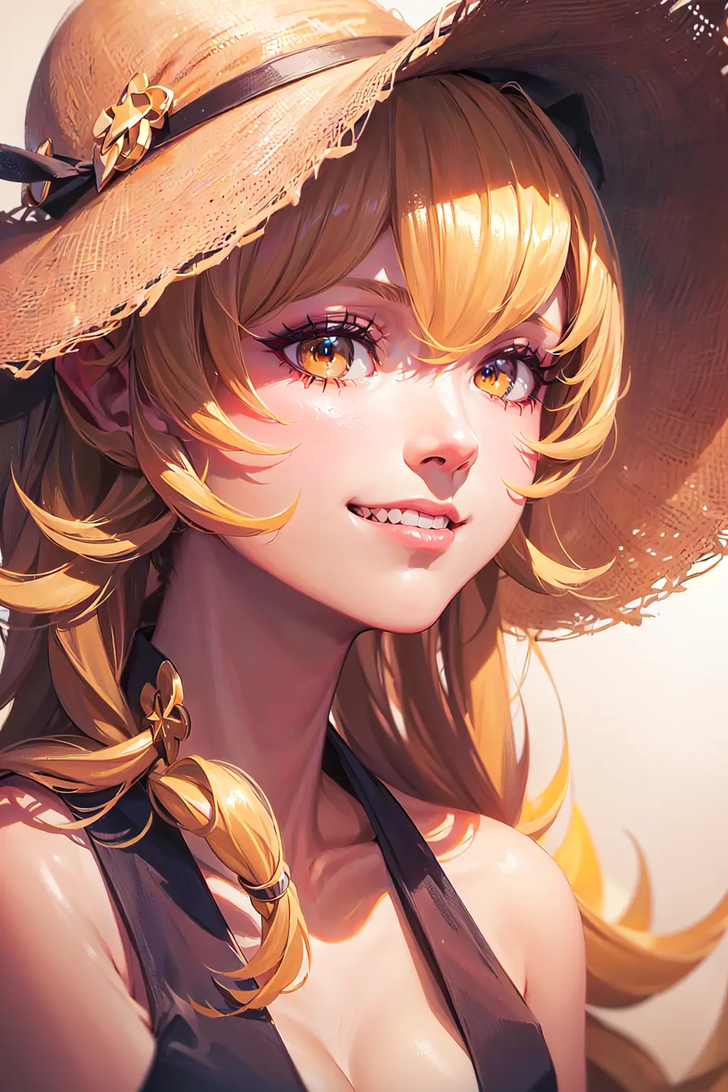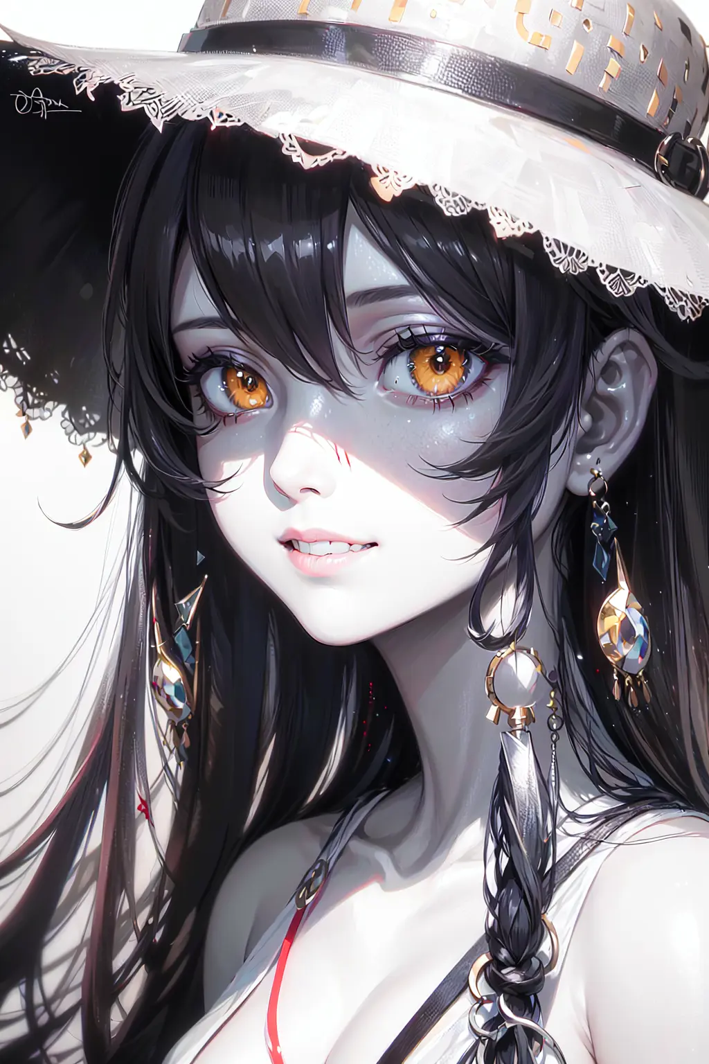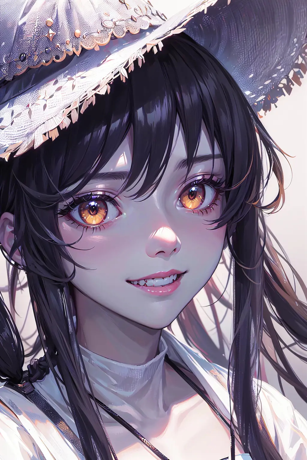 masterpice, best quality, 8K, highly detiled, 4k, ((( oshino shinobu))), petite, absurdly long hair, (hair flaps), (shiny hair), flipped hair, grin, ((monochrome)), yellow eyes, close-up, straw hat, (shaded face), white sundress, slit pupils, (blood from mouth), (realistic) by WLOP, trending on ArtStation