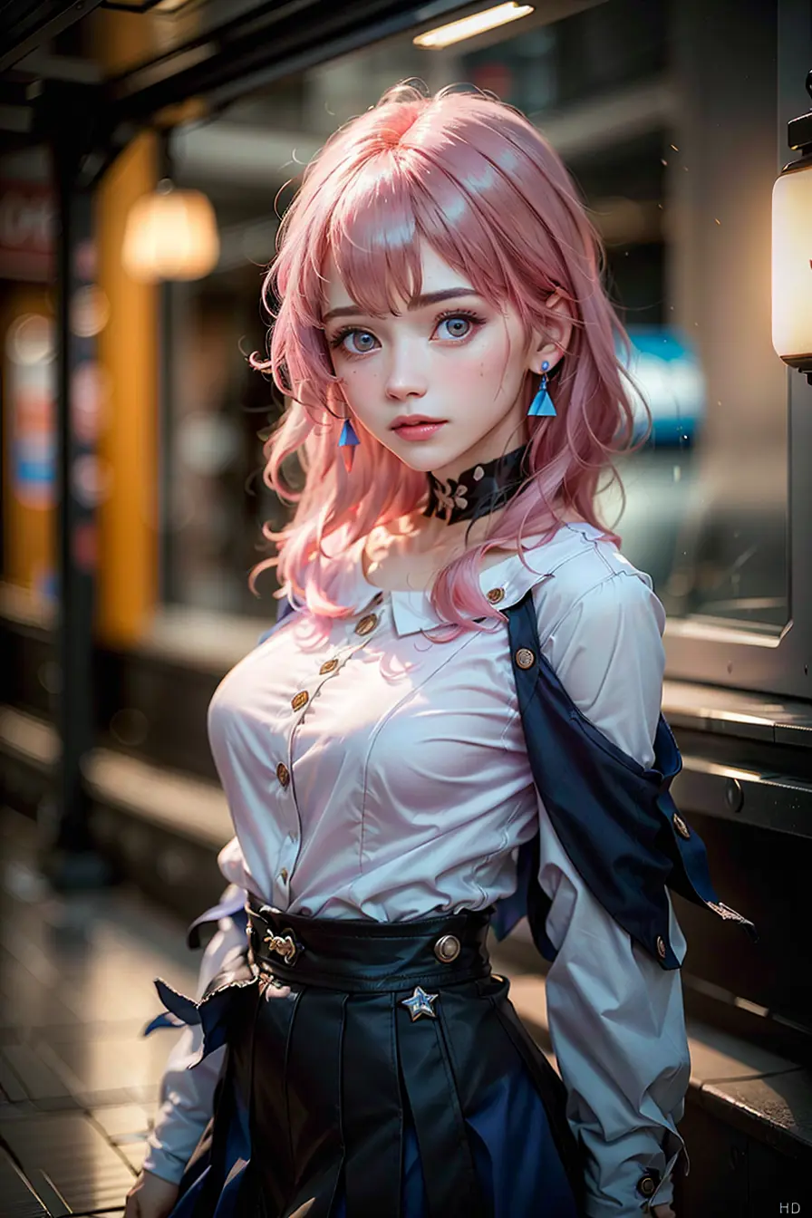 masterpiece, (photorealistic:1.5), best quality, beautiful lighting, real life, march 7th \(honkai: star rail\), 1girl, solo, beautiful girl, (pink hair), full body, (full body shot), blue skirt, skirt, blue shirt, white shirt, blue eyes, medium hair, blush, breasts, looking at viewer, small breasts, star earrings, intricate, high detail, sharp focus, dramatic, detailed face, detailed skin, beautiful face, beautiful eyes, (RAW photo, 8k uhd, film grain), caustics, subsurface scattering, reflections, standing, <lora:japaneseDollLikeness_v10:0.50> <lora:march_7th__honkai _star_rail__offset:0.8>