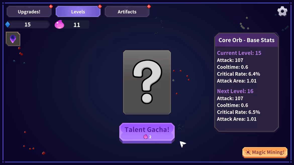 升级以获取法力并解锁天赋。天赋会进一步提升你的采矿能力。