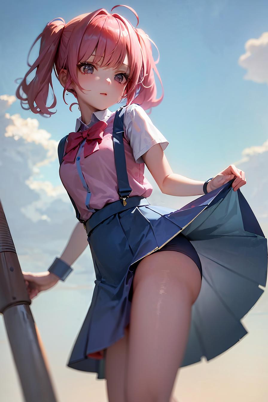 (masterpiece, best quality:1.3), 1girl, solo, young adult, nice hands, pink hair, pigtails, (short blue miniskirt:1.3), (blue skirt:1.2), (red suspenders:1.1), white shirt, low angle, view from low angle, seductive, sexy pose, visible feet, cute face, <lyco:envybetterhandsLocon_beta2:1>