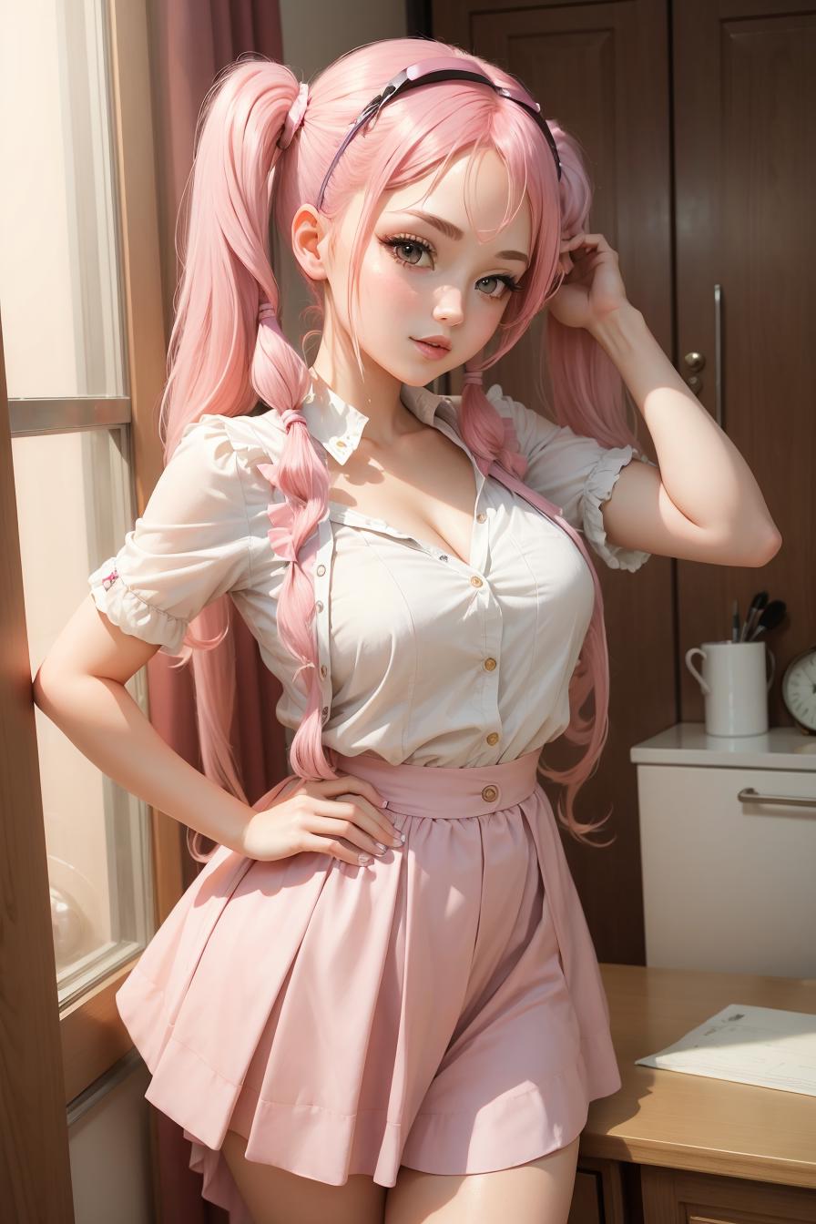 (masterpiece, best quality:1.3), 1girl, solo, young adult, nice hands, pink hair, pigtails, short skirt, seductive, sexy pose, <lyco:envybetterhandsLocon_beta2:1>