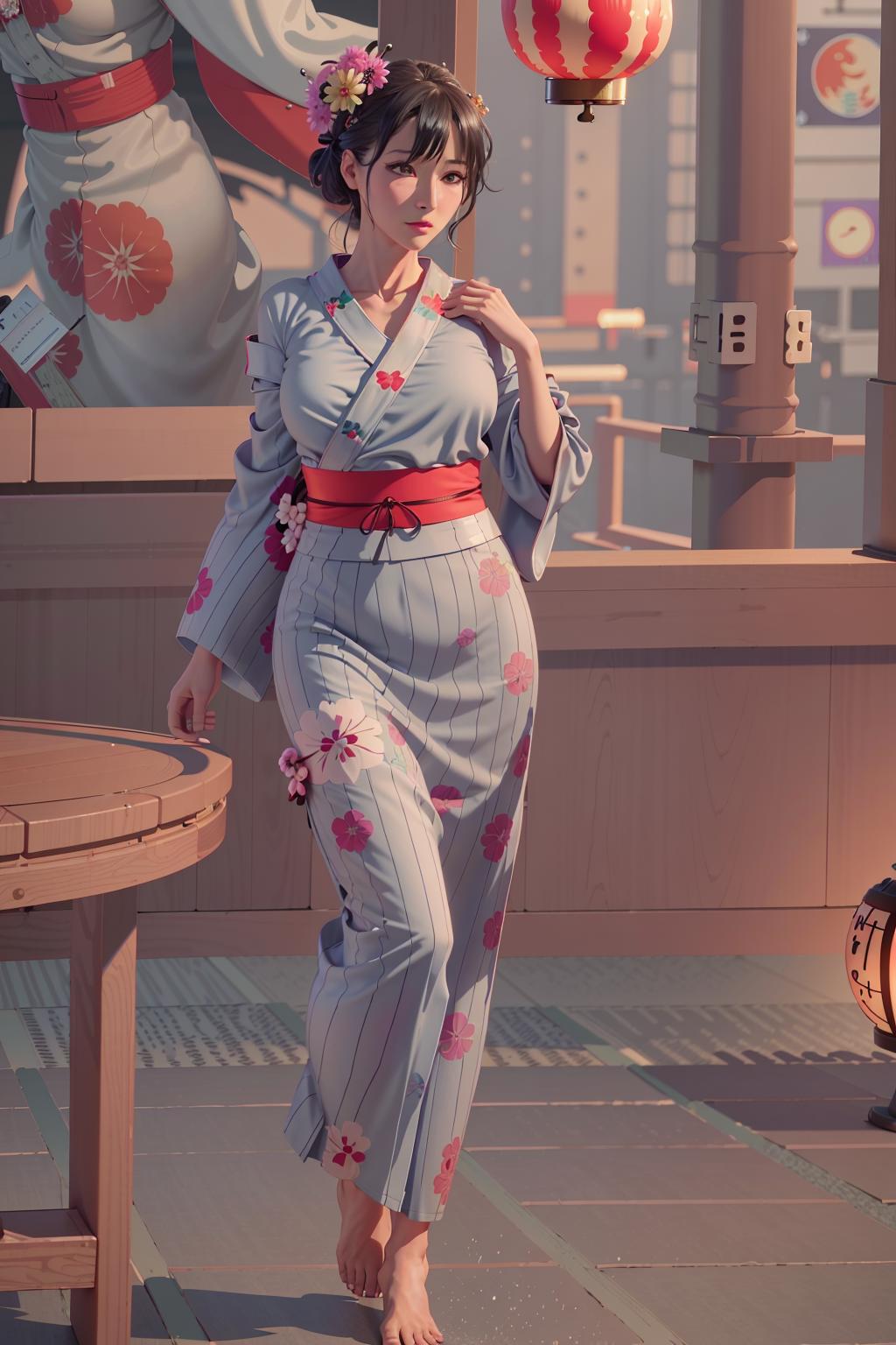 (masterpiece), (best_quality), (ultra-detailed), (illustration), (welcoming), bokeh,1girl, (clockwork welcoming queen:1.3), (in a dining room:1.3), (full body:1.4), magenta hair with ultraviolet highlights, curly hair, long hair,hair over one eye, (blush:1.3), , [:sexy, skimpy costume design:0.2], , medium breasts, wide hips, tall, slim hourglass figure,(muscular legs:0.6), skindentation, ((yukata, shoulder cutout:1.3):1.2), , official art, vivid color, finely detailed, hyper detailed, 8k, high resolution illustration, absurdres, intricate detail<lora:GoodHands-beta2:1.3><lora:EnvyColdShower_v11:1>