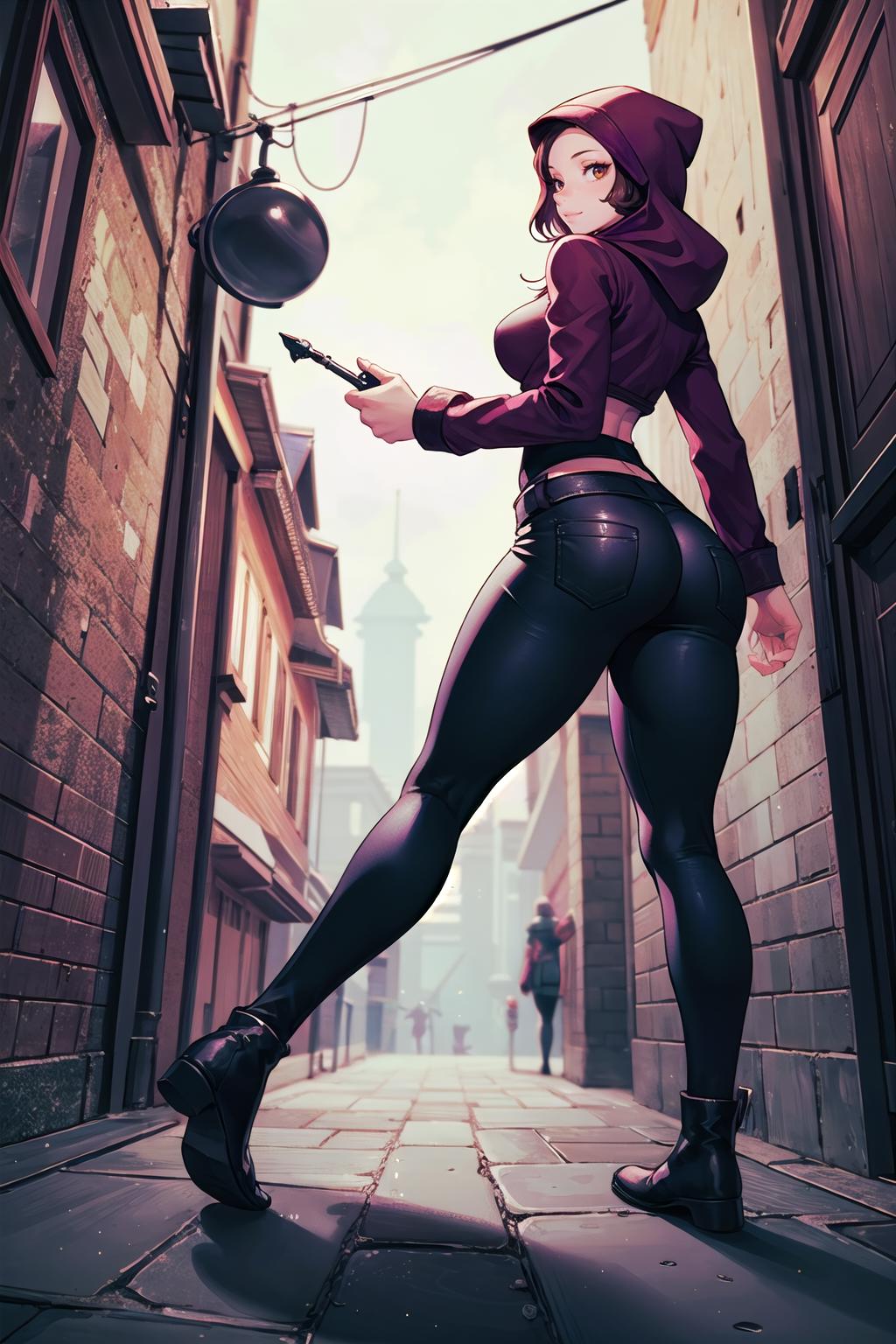 Rogue, leather armor, dagger, hood, black pants, boots. Sneaking through a dark alley, looking for a way to break into a wealthy merchant's mansion.